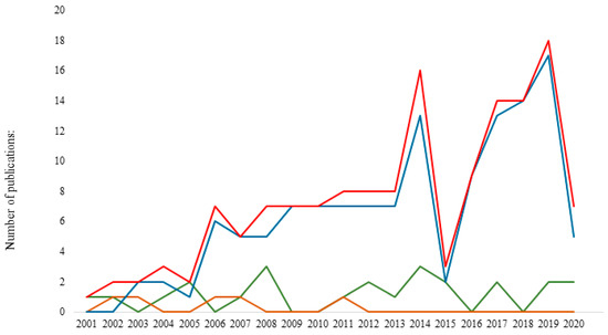 Number of publications through the years (2000–February 2021). The total number is indicated in red, and the other colored lines indicate the number of publications according to each detection method used (serology, microscopy, or molecular biology).