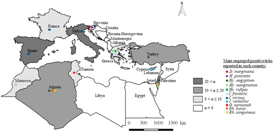 Distribution of main TBP-positive engorged tick species in Mediterranean Rim countries (n = number of TBP-positive engorged tick species by country).