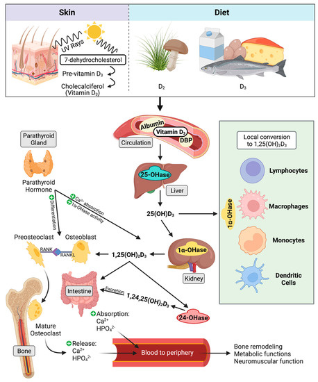 Vitamin D is synthesized in the skin or obtained from the diet. The most common and more potent form, vitamin D3, is focused on in this review. Vitamin D3 is converted to 25(OH)D3 in the liver. Classical effects on calcium homeostasis begin in the kidney, where 25(OH)D3 is converted to bioactive 1,25(OH)2D3. 1,25(OH)2D3 increases osteoclast differentiation and activation, and upregulates calcium and phosphate absorption in the gut. Concurrently with 1,25(OH)2D3, parathyroid hormone stimulates osteoclasts. It additionally upregulates 1α–OHase (CYP27B1) activity and calcium reabsorption in the kidney. 25(OH)D3 and 1,25(OH)2D3 are both inactivated by 24–OHase (CYP24A1) and are excreted in the bile. Non-classical signaling of vitamin D3 involves local activation of 25(OH)D3 to 1,25(OH)2D3 by 1α–OHase (CYP27B1) in cells of the immune system. Figure created using BioRender.com (accessed on 28 July 2022).