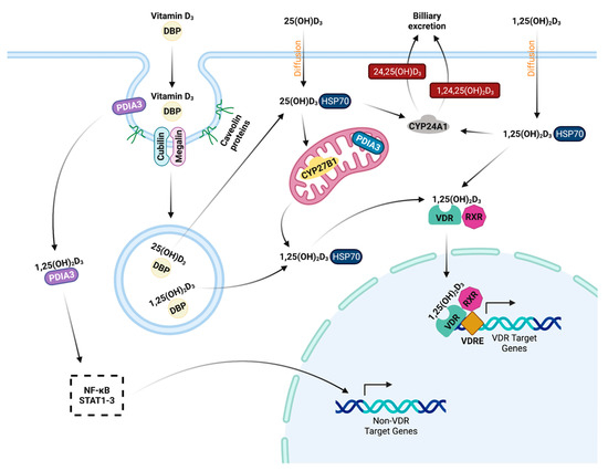 Physiologic activity of 1,25(OH)2D3 is facilitated through its binding of the nuclear hormone vitamin D receptor (VDR) (Figure 2). Collectively, VDR has been shown to have over 1000 target genes and is found in most tissues [147]. Genomic signaling pathways result in VDR dimerizing with retinoid X receptor (RXR) [148]. This complex directly binds the promoter of genes that possess vitamin D response elements, directly modulating their transcription. In a mouse VDR knockout model, animals observed abnormally increased 1,25(OH)2D3 serum levels, overexpression of CYP27B1, and nearly undetectable expression of vitamin D3-inactiving hydroxylase CYP24A1. Addition of 1,25(OH)2D3 did not downregulate CYP27B1 or increase CYP24A1 expression in the absence of VDR, indicating that when bound to its ligand VDR helps modulate essential hydroxylase expression [127]. Furthermore, non-genomic signaling of 1,25(OH)2D3 is thought to be facilitated through the binding of modified membrane VDRs, one of which is called protein disulphide isomerase family A member 3 (PDIA3) [149]. Uptake of the vitamin D3 bound PDIA3 complex has been shown to be a result of caveolae-mediated endocytosis [150]. Vitamin D3 signaling through these membrane VDRs are thought to modulate rapid responses to 1,25(OH)2D3 and signaling through PDIA3 can initiate cellular responses through the pro-inflammatory nuclear factor κB (NF-κB) and signal transducer and activator of transcription 3 (STAT3) pathways [151,152].