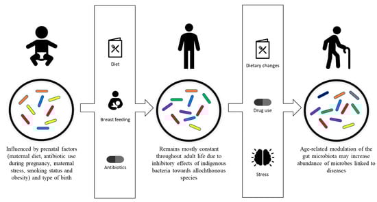 - Hasan, N.; Yang, H. Factors affecting the composition of the gut microbiota, and its modulation. PeerJ 2019, 7, e7502. [Google Scholar] [CrossRef] [PubMed]