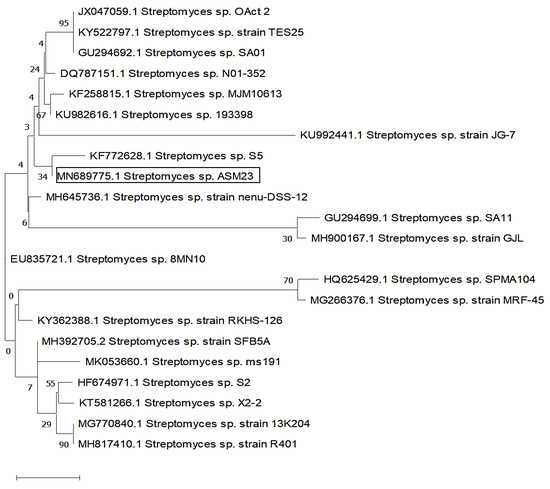 Sequencing of 16S rDNA has been carried out to identify the ASM23 isolate. The DNA was isolated, amplified using PCR, sequenced, and aligned using the NCBI Online BLAST tool to examine similarity scores with other identified strains. The results confirmed a high similarity rating of 99.72% homology of isolate ASM23 with Streptomyces sp. The partial 16S rDNA sequence of the Streptomyces isolate was deposited in the GenBank with the MN689775 accession number under the title Streptomyces sp. ASM23. The phylogenetic trees have been built by MEGA-X and a maximum likelihood method (Figure 2) [33].