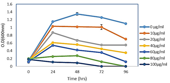The most successful treatment was subjected to further investigations of the effect of different AgNPs concentrations along the E. coli growth curve. The antibacterial effectiveness of different concentrations of filtrate AgNPs’ solution (0, 20, 40, 60 and 80, 100 µg/mL) was tested to examine its activity on the bacterial growth curve for E. coli bacterial colonies. These were inoculated with nutrient broth media till reaching optical culture density (OD600) 0.25–0.35. Different concentrations of AgNPs’ solution (0, 20, 40, 60, 80, and 100 µg/mL) were added to the inoculated cultures. The cultures were incubated at 37 °C at 180 rpm. Bacterial densities were followed by determining the optical density (OD) at 600 nm after 0, 24, 48, 72, and 96 hrs [30].