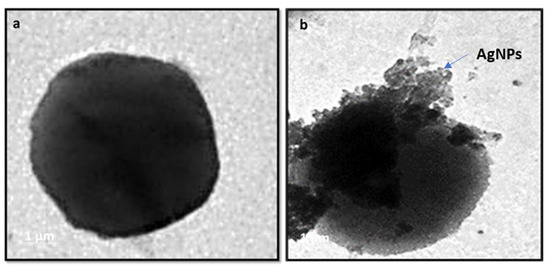 Accumulation of AgNPs on the S. aureus outer cell membrane (a) Bacteria with no treatment and (b) Bacteria treated with AgNPs.