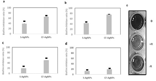 The biofilm inhibition ratio of AgNPs prepared by Streptomyces sp. ASM23 cell supernatant (S) and cell filtrate (CF) against four clinical microbes (a) B. subtilis, (b) E. coli (c) S. aureus, and (d) P. aeruginosa. The bars on the graph represent the mean of triplicate, and SD. (e) Microtiter plate, (Ø) blank, (+R) positive result, and (−R) negative result.