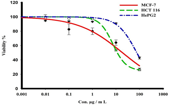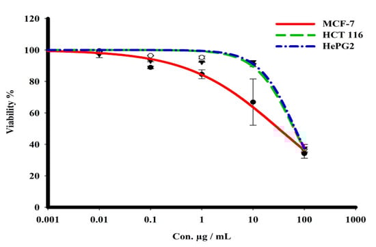 The dose–response curve of biosynthesized AgNPs from the cell supernatant of Streptomyces sp. ASM23 on the cytotoxicity in MCF-7, HePG2, and HCT 116 cell lines. Cells were exposed to biosynthesized AgNPs from the cell supernatant of Streptomyces sp. ASM23, with different concentrations of compounds for 72 h. Cell viability was detected by SRB stain.