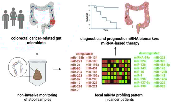 Fecal miRNA profiling as a diagnostic and prognostic tool in colorectal cancer. The clinical studies showed numerous up- or downregulated miRNA in CRC patients compared to control subjects. Moreover, the changes in fecal miRNA levels are correlated with disease prognosis. Thus, high-throughput screening of fecal miRNA profile represents a potential, noninvasive trend in patient care. The use of personalized miRNA-based therapy might lead to improvements in survival and outcomes for cancer patients. The figure was created with BioRender.com (accessed on 16 November 2022).