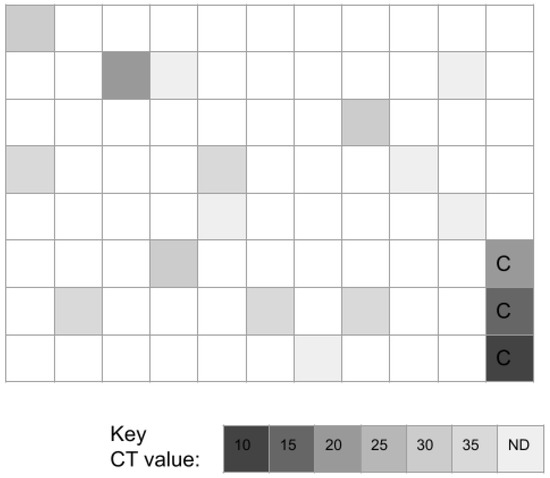 Molecular screening of adult study samples revealed n = 15/86 or 17.4% harbored DNA specific for AM (Figure 2). Only four samples exhibited cycle threshold detection levels in the high (C16–C20, n = 1/15 or 6.7%), moderate-high C21–C25, n = 0/15 or 0.0%) or moderate (C26–C30, n = 3/15 or 20.0%) range. In contrast, nearly three-fourths (n = 11/15 or 73.3%) exhibited cycle threshold detection levels in the low-moderate (C31–C35, n = 5/15 or 33.3%) or low (C36–C40, n = 6/15 or 40.0%) range.