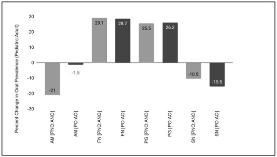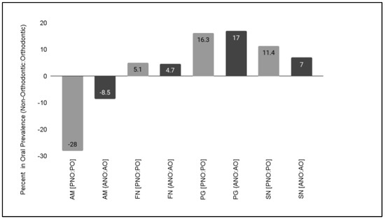 To determine if the changes in oral prevalence were correlated with orthodontic therapy, differences between the orthodontic and non-orthodontic samples were analyzed (Figure 4). These data demonstrated that a large difference in the oral prevalence of AM was observed between the pediatric non-orthodontic (42.3%) and pediatric orthodontic (14.3%) samples of −28.0%. In addition, the difference in oral prevalence between adult, non-orthodontic (21.3%) and adult, orthodontic (12.8%) samples was found to be −8.5%.