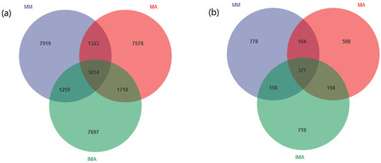 OTUs Venn diagrams. (a): OTUs detected in bacteria; (b): OTUs detected in fungi. MM: Morus alba; MA: Medicago sativa; IMA: Morus alba–Medicago sativa.