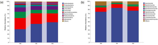 In the bacterial community, there are four dominant phylas, namely Actinobacteria, Proteobacteria, Acidobacteria and Chloroflexi (Figure 2a). Actinobacteria maintained the highest relative abundance in the three groups. Its relative abundance in IMA and MA was significantly higher than that in MM (p < 0.05). The relative abundance of Proteobacteria in IMA was significantly lower than that in the other two treatments (p < 0.05). Chloroflexi and Acidobacteria in MM had the highest relative abundance (15% and 11%, respectively), which was significantly higher than that of IMA and MA (p < 0.05) (Table 2). In the fungal community, the relative abundance of ascomycota in each treatment was more than 70%, which was in an absolutely dominant position (Figure 2b). The relative abundance of ascomycetes of MA was 84%, which was significantly higher than MM (p < 0.05), but it had no significant difference with IMA (p > 0.05) (Table 2).