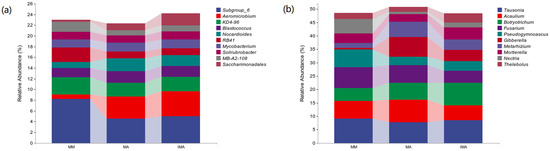 The community structure of bacteria (fungi) under different treatments was significantly different at genus level. Subgroup_6 and Aeromicrobium prevailed in the community (relative abundance > 5%), but their abundance distributions were different in different treatments (Figure 3a). In MM, the relative abundance of Subgroup_6 was significantly higher than that of IMA and MA (p < 0.05), while that of Aeromicrobium was significantly lower than that of other treatments (p < 0.05). There was no significant difference between IMA and MA (Table 3). There are six dominant genera of fungi (Figure 3b). Tausonia, Acaulium and Fusarium showed no significant differences among the three treatments. The relative abundance of Botryotrichum in IMA was significantly higher than that of MM, that of Pseudogymnoascus was significantly higher than that of IMA, and that of Gibberella was the highest in MA but not significantly different from that of IMA (Table 3).