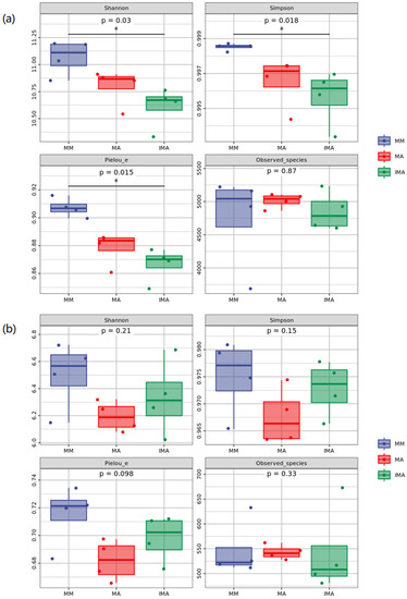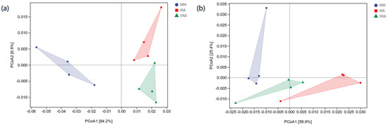 There was no significant difference in the normalized abundance of functional units of bacteria and fungi. Therefore, we used the sample differential distance matrix combined with principal coordinate analysis (PcoA) to expand the sample functional differences in a low dimension. The first axis of bacterial functional unit PcoA explained 84.2%, and the second axis only explained 6.8%. IMA and MA are located on the same side of the first axis and are far away from MM (Figure 4a). The first axis of fungal functional unit PcoA explained 58.9%, and the second axis explained 25.4%. IMA and MA are located on the same side of the second axis and are far away from MM. The three groups were treated at similar distances (Figure 4b). In general, MA and IMA have higher similarities in bacterial and fungal functions.