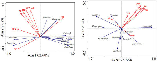 Redundancy analysis (RDA) was used to further analyze the effects of soil physical and chemical properties on soil microbial community structure. The first two axes of bacterial RDA explained 62.68% and 3.08% of the total variance, respectively, for a total of 65.76%. Soil pH (p = 0.042) and TP (p = 0.044) were the most important factors affecting the soil bacterial community. Soil pH was negatively correlated with Actinobacteria and positively correlated with Chloroflexi, Proteobacteria and Acidobacteria. The correlation between TP and the above phylum was the opposite (Figure 6a). The first two axes of fungal RDA explained 78.86% and 2.59% of the total variance, respectively, accounting for 81.44%. Soil TN (p = 0.020) and TC (p = 0.040) were the most important factors affecting the soil fungal community, and they were positively correlated with Ascomycota (Figure 6b).