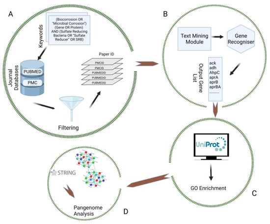 Text-mining workflow utilized to obtain relevant gene lists. (A) Query formulation to extract relevant research articles; (B) Gene mining from the literature; (C) Enrichment analysis of the gene sets; (D) Pangenome and PPI network analysis.