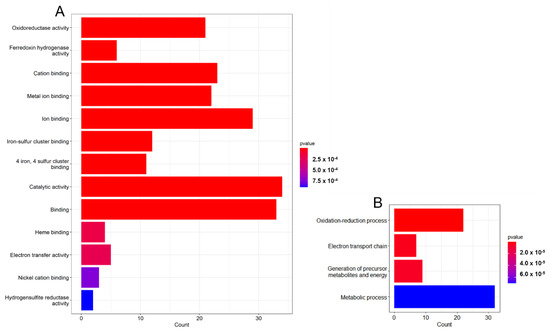 The functional annotation was performed using the UniProt database for the selected gene list. This allowed us to classify the gene list on the basis of gene ontology (GO) terms, biological process (BP), molecular function (MF), and cellular component (CC), where GO defines the characteristics of genes and gene products. The cellular component indicates a region of an active gene product in a cell, whereas the MF defines the basic activity of a gene product at the molecular level. Finally, the BP is described as the contribution of genes and gene products to the biological objective [16]. Figure 2 signifies the enriched GO terms in the molecular function and biological process category. As can be noted from Figure 2, all the enriched GO terms are statistically significant with a p-value < 0.05. The MF and BP plots show that the enriched terms belong to electron transport, ion binding (ATP binding), and metal ion binding pathways necessary for the growth and survival of bacteria. In addition, microbes depend on the oxidation/reduction processes for ATP generation and growth.