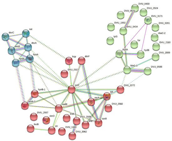 The PPI network demonstrates three cluster formations. Cluster 1 (red) shows the genes involved in metal ion binding and oxidoreductase activity. Cluster 2 (green) represents the genes participating in cellular respiration, oxidation-reduction activity, and electron transport. Lastly, cluster 3 (cyan) displays genes engaged in oxidoreductase, hydrogenase and hydrogensulfite reductase activity.