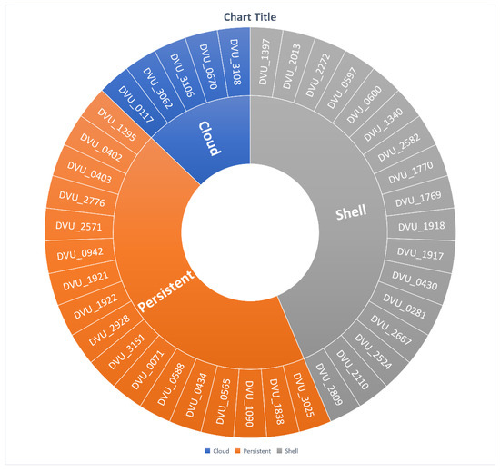 Currently, researchers mostly use probabilistic models [28] and the Binomial Mixture Model [29,30] for pangenome analysis. PPanGGOLiN was utilized to categorize the genes based on a statistical method to classify them according to their occurrence in 63 SRB genomes. Unlike the existing approaches, PPanGGOLiN does not rely on frequencies to execute gene characterization, but is a combination of gene family occurrence patterns and topology of the pangenome graph. This graph-based approach effectively generates a compact structure which describes the genomic distinctiveness of a large number of strains. Based on the presence of the gene families across pangenome, the gene families can be divided into three main classes: (1) persistent, which includes gene families existing in nearly all genomes; (2) shell, comprising gene families appearing at moderate frequencies in the species; and (3) cloud, containing gene families existing in small frequencies in species [13]. In our study, the persistent category consisted of 17 genes, the shell comprised 17 genes, and the remaining 5 genes were a part of the cloud gene families (Figure 4).