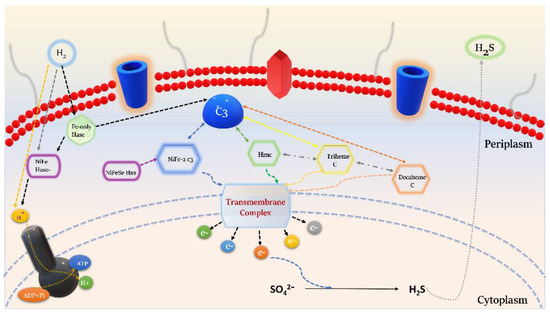 SRB has intricate electron transport chains (ETC) that permit sulfate reduction by oxidation of either molecular hydrogen or organic compounds [44]. The initial step in the ETC process is the oxidation of hydrogen in the periplasm. The periplasmic hydrogenases metabolize H2 and facilitate its diffusion to the periplasm, where molecular hydrogen splits into electrons and protons. DVU3171 (tetrahemic cytochrome c3) is considered the primary electron acceptor from the oxidation of periplasmic hydrogen [54]. Now, the protons generate a proton-motive force for the production of ATP. Simultaneously, the cytochrome c3 network and various transmembrane complexes cycle back the electrons to the cytoplasm for sulphate reduction and other metabolic processes (Figure 5). The genome analysis of DvH also indicated the presence of alternate c3-type cytochromes (DVU2524 and DVU2809). DVU2524 could act as an electron acceptor for hynAB (DVU1921/22), whereas DVU2809 is part of the formate dehydrogenase operon, indicating that this tetraheme cytochrome c3 can accept electrons evolving from the oxidation of formate. A vast network of interlinked hemes implies intermolecular electron transfer amongst the various c-type cytochromes [14,55,56]. Heidelberg et al., 2004 also proposed a similar electron transfer mechanism in their study with D. vulgaris Hildenborough, suggesting this network-type to act as the connecting bridge for multiple periplasmic enzymes, including hydrogenases [14].