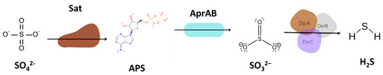 Among microbes, the assimilatory sulfate reduction process is most prevalent, whereas dissimilatory sulfate reduction is observed only in limited microbial communities, including SRB. The first step in the dissimilatory sulfate reduction pathway is carried out by sulfate adenyl transferase (sat), which produces Adenosine-5′-phosphosulfate (APS) by the activation of sulfate, and, subsequently, reducing APS to sulfite by AprAB. Next, sulfite is partially reduced to hydrogen sulfide (H2S) by DsrAB (Dissimilatory sulfite reductase). Finally, DsrC carries out the final sulfite reduction to H2S (Figure 6) [60].