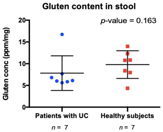 Using data captured in the FFQ, gluten intake was assessed based on subject reported consumption of gluten containing foods and compared between healthy subjects and UC patients. Gluten consumption was not found to significantly differ between groups (Supplementary Table S2). A comparative analysis revealed that the concentration of gliadin and glutenin (the metabolites of gluten) in feces of subjects, as assessed by gluten-specific ELISA, did not differ between the two groups (Mann–Whitney; p > 0.05) (Figure 1 and Figure S1), suggesting that UC patient retain the ability to degrade gluten despite loss of microbial function in their gut microbiome.