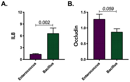 Expression of (A) IL8 and (B) occludin genes in colonic epithelial cells exposed to gluten degradation products produced by Bacillus and Enterococcus isolates. Results were obtained from two independent experiments and based on combined observations from 2 strains for each genera. Statistical significance was determined using Mann–Whitney test.
