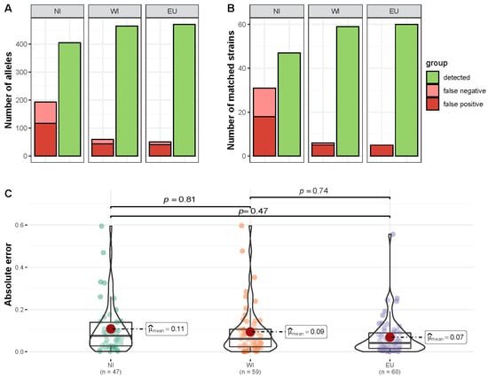 For matching strain profiles, we compared predicted abundances from StrainEST to known proportions utilized for the mixtures and observed a mean absolute error between 0.07 and 0.10 (Figure 2C), with abundance ranks matching in 60% (WI and EU) and 33% (NI) of cases.