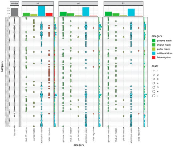 Overview of predicted 9MLST profiles compared to isolated strains according to categories of matches (Supplementary Data S4). Panels are separated according to the utilized database (NI: without isolates from this study, WI: including isolates from this study, EU: including isolates from this study and only reference genomes from Europe) with a separate panel highlighting the number of recovered isolates on the left. Sample identifiers starting with B represent wild bird samples and W stands for surface water samples. Point size indicates the number of strains assigned to each category.