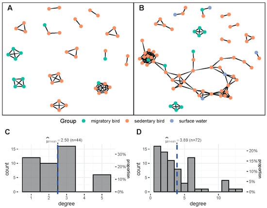 Network connectivity of individual samples based on co-occurrence of 9MLST profiles within the combined dataset (Supplementary Data S5). Each node represents an individual sample, colored according to its origin. (A) Network based on isolated strains. (B) Network based on the combined dataset of isolated strains and metagenomic samples. (C) Histogram of degree values for each node for the graph in (A). (D) Histogram of degree values for each node for the graph in (B).