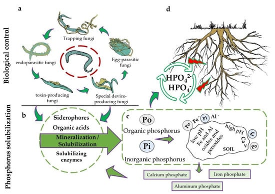 Systematic diagram of P solubilization by fungi used in the biological control of nematodes. (a) Nematodes can be parasitized and predated by (in clockwise order) trapping fungi, egg-parasite fungi, special device-producing, or toxin-producing and endoparasitic species. (b) Compounds produced by fungi. (c) Chemical reactions of P in soil, binding with elements such as calcium, iron, and aluminum that can then be mineralized or solubilized by the NF compounds. (d) Roots absorbing negatively charged orthophosphate ions.