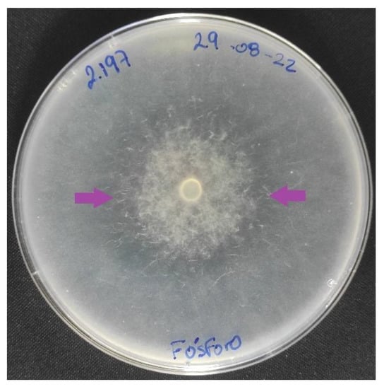 Nematode-capturing fungus Arthrobotrys oligospora. Phosphate solubilization zone on Pikovskaya agar plates, as shown by the halo (arrows).