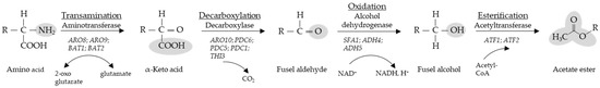 The Ehrlich pathway. Conversion of amino acids into fusel aldehydes, fusel alcohols and acetate esters. Enzymes and encoding genes known in S. cerevisiae to catalyze the reactions are indicated. Specific molecular groups are highlighted. Modified from Hazelwood et al. [10].