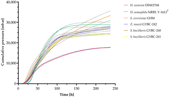 Fermentations of all individual yeast strains in SM-mix were performed to analyze the fermentation kinetics and evaluate their fermentation performance within this must (Figure 2). The cumulative pressure of fermentations using H. osmophila reached a plateau phase after ~180 h (~7.5 days) indicating the end of fermentation. Fermentations with the other yeast strains showed slightly increasing pressure until the end of the experiment, with S. cerevisiae having a steadier increase reaching the highest value of cumulative pressure measured. In contrast, the fermentations with H. uvarum yielded the lowest value of cumulative pressure, which was about half of the pressure achieved by S. cerevisiae. Fermentations using both Z. rouxii and the S. bacillaris strains showed similar patterns in fermentation performance, slightly resembling in appearance to that of H. osmophila. Among all yeasts, S. cerevisiae was the first one reaching a cumulative pressure of one bar (~18.75 h) in the SM-mix fermentations, followed by S. bacillaris GYBC-240 (~20.67 h) and H. uvarum (~21 h). Z. rouxii and S. bacillaris GYBC-241 (both ~23.67) were found to exceed this value even before H. osmophila (~29.67 h).
