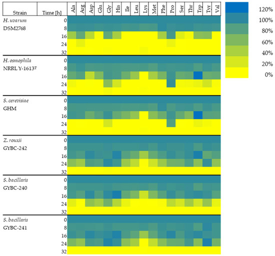 To evaluate the consumption rate of 17 amino acids (Cys, Asn and Gln could not be measured), we generated a synthetic must supplemented with defined amounts of these amino acids (Table 2). Fermentations of these musts by H. uvarum, H. osmophila, Z. rouxii GYBC-242 and S. bacillaris GYBC-240 & GYBC-241 were carried out over a duration of 32 h (Figure 3, Figure S1) and the amino acid concentrations in the supernatants of these fermentations were quantified in eight-hour intervals. The results of the amino acid uptake of the yeasts at the individual time points compared to the initial values are described below.
