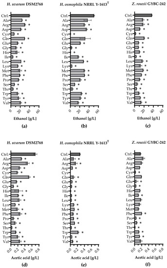 Ethanol production and formation of acetic acid during fermentation with individually supplemented amino acids. Ethanol production [g/L] in fermentations using (a) H. uvarum DSM2768, (b) H. osmophila NRRL Y-1613T and (c) Z. rouxii GYBC-242. Formation of acetic acid [g/L] in fermentations using (d) H. uvarum DSM2768, (e) H. osmophila NRRL Y-1613T and (f) Z. rouxii GYBC-242. Fermentations using the respective yeast with SM-mix served as control (Ctrl.). Ethanol and acetic acid concentrations were measured via high performance liquid chromatography (HPLC) analysis. Data are the mean of three independent experiments ± SEM, two-tailed unpaired t test with Welch’s correction, * p < 0.05 as compared to the control. Error bars indicate the standard deviation.