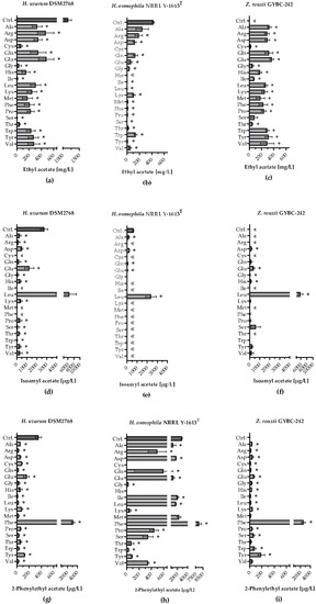 Production of acetate esters during fermentation with individually supplemented amino acids. Ethyl acetate production [mg/L] in fermentations using (a) H. uvarum DSM2768, (b) H. osmophila NRRL Y-1613T and (c) Z. rouxii GYBC-242. Isoamyl acetate production [µg/L] in fermentations using (d) H. uvarum DSM2768, (e) H. osmophila NRRL Y-1613T and (f) Z. rouxii GYBC-242. 2-Phenylethyl acetate production [µg/L] in fermentations using (g) H. uvarum DSM2768, (h) H. osmophila NRRL Y-1613T and (i) Z. rouxii GYBC-242. Fermentations using the respective yeast with SM-mix served as control (Ctrl.). Acetate esters were measured via HS-SPME-GC-MS analysis. Data are the mean of three independent experiments ± SEM, two-tailed unpaired t test with Welch’s correction, * p < 0.05 as compared to the control. Error bars indicate the standard deviation; «: not quantifiable.