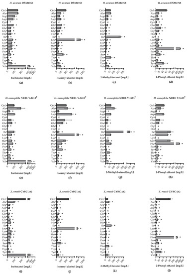 Formation of higher alcohols during fermentation with individually supplemented amino acids. Formation of isobutanol [mg/L] in fermentations using (a) H. uvarum DSM2768, (e) H. osmophila NRRL Y-1613T and (i) Z. rouxii GYBC-242. Formation of isoamyl alcohol [mg/L] in fermentations using (b) H. uvarum DSM2768, (f) H. osmophila NRRL Y-1613T and (j) Z. rouxii GYBC-242. Formation of 2-methyl butanol [mg/L] in fermentations using (c) H. uvarum DSM2768, (g) H. osmophila NRRL Y-1613T and (k) Z. rouxii GYBC-242. Formation of 2-phenyl ethanol [mg/L] in fermentations using (d) H. uvarum DSM2768, (h) H. osmophila NRRL Y-1613T and (l) Z. rouxii GYBC-242. Fermentations using the respective yeast with SM-mix served as control (Ctrl.). Higher alcohols were measured via HS-SPME-GC-MS analysis. Data are the mean of three independent experiments ± SEM, two-tailed unpaired t test with Welch’s correction, * p < 0.05 as compared to the control. Error bars indicate the standard deviation; «: not quantifiable.