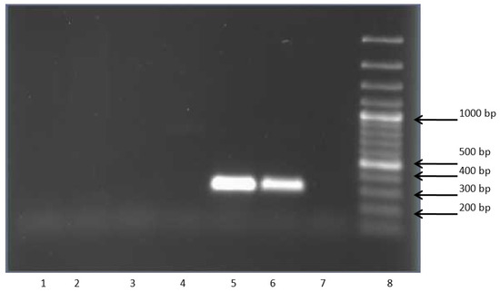 Electropherogram of clcF gene amplification products. 1—Rhodococcus rhodochrous 89, 2—Gordonia polyisoprenivorans 135, 3—Microbacterium foliorum B51, 4—Arthrobacter agilis Lush13, 5—Rhodococcus wratislaviensis G10, 6—Rhodococcus opacus 1CP (resting phase), 7—negative control, 8—molecular weight marker 100 b.p. Plus DNA Ladder (Fermentas, Latvia).