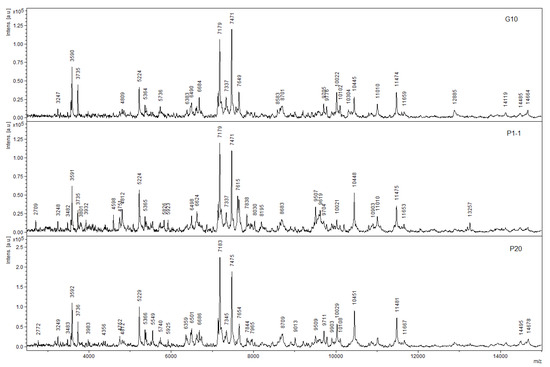 MALDI-ToF spectra of partially purified preparations of ClcF R. wratislaviensis G10, P1, P20 (from top to bottom).