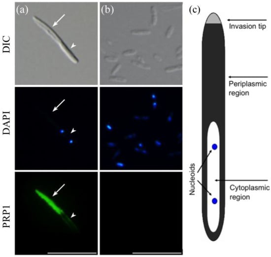 Indirect immunofluorescence micrographs of H. obtusa with monoclonal antibodies mAb3D1B9C4 specific for the 63-kDa periplasmic protein PRP1. Left (a), IF; middle (b), RFs; right (c), a schematic representation of the IF of H. obtusa. Upper photos, differential interference contrast (DIC); middle photos, DAPI fluorescence; lower photos, AF488 immunofluorescence. Only a periplasmic region (arrow) except an invasion tip of the IF shows immunofluorescence. Because the cytoplasmic region of the IF is covered with a thin layer of the periplasm, a faint immunofluorescence layer appears around the cytoplasmic region. A cytoplasmic region (arrowhead) with two DAPI-positive nucleoids shows no immunofluorescence. H. obtusa cells on cover glasses and were permeabilized with 20 mM NaOH to allow antibodies entry inside the outer membrane. The RF shows no immunofluorescence. Scale bar, 10 µm.