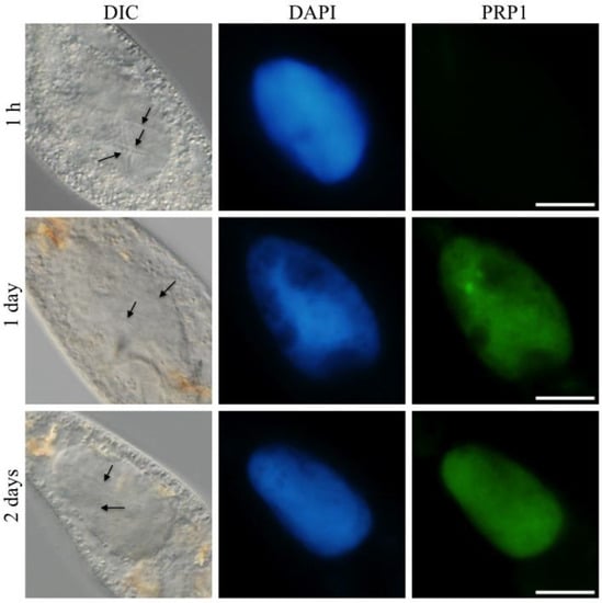 Abamo et al. [25] reported that the PRP1 of the IFs was secreted into the host macronucleus at or later than 3 h after invasion of H. obtusa into the macronucleus. To confirm whether the secreted PRP1 in the macronucleus could be transferred to the host cytoplasm, infection experiments were conducted without permeabilization using 20 mM NaOH. One hour after mixing of the IFs with P. caudatum cells, an immunofluorescence of PRP1 was still not detectable in the host macronucleus, despite the presence of the IFs in the host macronucleus (Figure 2, 1 h, PRP1). Usually, the first IF invades into the target macronucleus within 10 min after mixing with P. caudatum cells [28], and number of the infected IFs in the macronucleus increases to around 10 cells till 1 h after mixing. The immunofluorescence of PRP1 became detectable in the macronucleus 1 day after mixing (Figure 2, 1 day, PRP1), but no fluorescence was detectable in the host cytoplasm even 2 days after mixing notwithstanding that macronuclei were showing strong fluorescence (Figure 2, 2 days, PRP1). As shown in Figure 2, the fluorescence of DAPI and PRP1 in the macronucleus on day 1 matches well. This indicates that the inability of PRP1 to translocate outside the macronucleus may be due to its binding to the macronuclear DNA or macronuclear chromatin proteins. The reproducibility of the results shown in Figure 2 was confirmed twice.