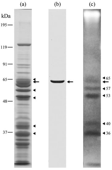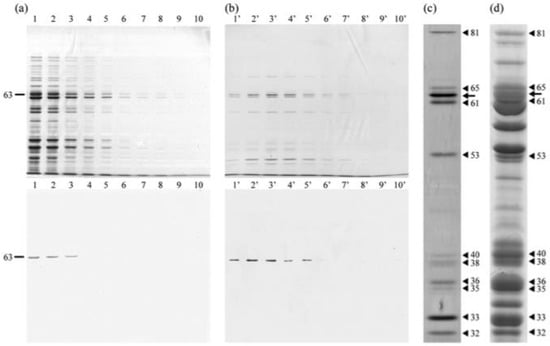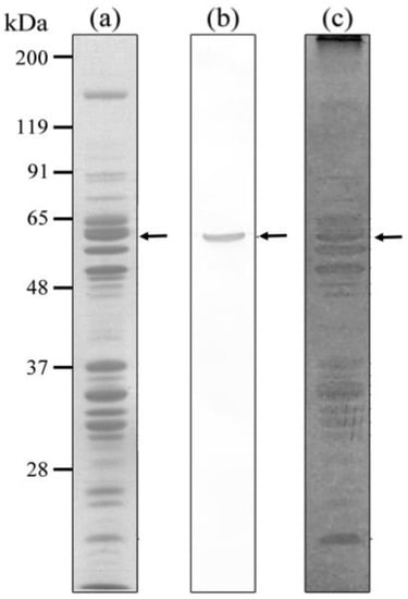 - Laemmli, U.K. Cleavage of structural proteins during the assembly of the head of bacteriophage T4. Nature 1970, 121, 680–685. [Google Scholar] [CrossRef]