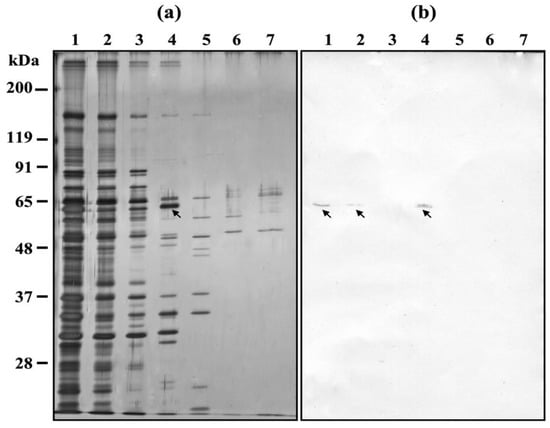 DNA affinity chromatography of H. obtusa IFs. P. caudatum DNA was used. (a) Silver stained SDS-PAGE gel; (b) immunoblotting with the monoclonal antibody mAb3D1B9C4 specific for the 63-kDa periplasmic protein PRP1 of H. obtusa. Lane 1, supernatant of sonicated H. obtusa before applying to DNA affinity chromatography column; lane 2, first elute of supernatant of sonicated H. obtusa after applying to the column; lane 3, first elute by elution buffer containing 0.02 M NaCl; lane 4, first eluate by 0.1 M NaCl elution buffer; lane 5, first eluate by 0.2 M NaCl elution buffer; lane 6, first eluate by 0.3 M NaCl elution buffer; lane 7, first eluate by 2 M NaCl elution buffer; arrows, PRP1. Eluates from each column were collected in every 200 μL, and the first eluate from each column was used for SDS-PAGE and immunoblot with mAb. Note that not only PRP1 but also several silver stained bands were confirmed in lane 4 of (a).