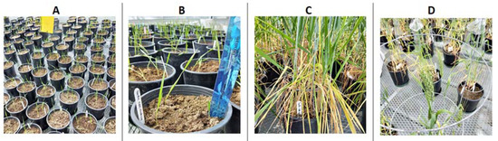 Greenhouse study conducted in Plant Science growth chambers at the University of Saskatchewan. Wheat: (A) germinant stage; (B) seedling stage; (C) vegetative stage with tillers; (D) reproductive stage with heads.