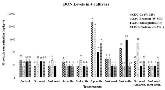 The treatments Sm anth. and SmF seed + SmF anth. were the most effective at reducing the occurrence of DON to levels below the LOQ in all four (4) cultivars compared to both the control and F.gr.anth. treatments. With these two treatments, the DON levels in both wheat cultivars, CDC Go and AAC Brandon, were reduced by at least 99.9% and 99.8%, respectively, compared to the F.gr.anth. treatment. In the durum cultivar AAC Strongfield, DON occurrence was reduced by at least 98.4% with both treatments compared to the F.gr.anth. treatment. In the case of the durum cultivar CDC Credence, Sm anth. treatment reduced DON levels by at least 97.2%, and SmFseed + SmF anth. treatment reduced DON levels by at least 96.8% when compared to the F.gr.anth. treatment. In all treatments, the highest DON concentration (29720 μg·kg−1) was detected with treatment 6 (F.gr.anth.) in the moderately susceptible wheat cultivar CDC Go (Table 2). The lowest DON levels were detected with treatment 3 (Sm anth.) in all four cultivars. Overall, a higher concentration of DON was detected in the two common wheat cultivars (CDC Go and AAC Brandon) compared to the two durum wheat cultivars (AAC Strongfield and CDC Credence. The concentration of DON was also detected as being higher in the two moderately susceptible cultivars (CDC Go and AAC Strongfield) compared to the more resistant cultivars AAC Brandon and CDC Credence (Table 2).
