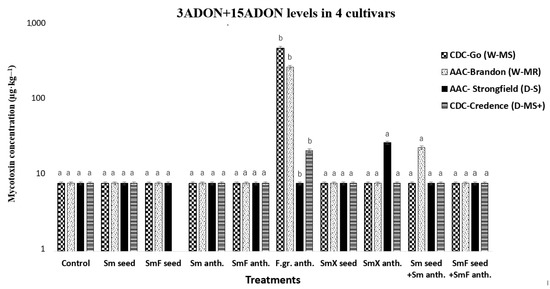 In the moderately susceptible cultivar CDC Go, DON was reduced by all BCA treatments by at least 99.9% when compared to F.gr.anth. (treatment 6). In the moderately resistant wheat cultivar AAC Brandon, there was at least a 90–99% reduction in DON, and in the moderately susceptible plus durum cultivar CDC Credence there was at least a 96–97% reduction in DON. The efficacy of BCAs in reducing DON and other Fusarium mycotoxins has been reported in other studies with Trichoderma- [47] and Clonostachys rosea-formulated CLO-1 [65] products, albeit with limited efficacy. Of all the BCA treatments used in this study, treatment 4 (Sm anth.) and treatment 9 (SmF seed + Sm F anth.) were more effective at reducing DON levels in all four cultivars when compared to treatment 6 (F.gr.anth.). These two treatments also reduced DON concentration to comparable levels below that of the control plants. Previous studies on S. mycoparasitica [60] revealed that S. mycoparasitica degraded DON by 89% to a lesser toxic metabolite, deoxynivalenol sulphate ([M−COCH3+SO3-CH2O]). As was expected, the Fusarium treatment F.gr.anth. resulted in the highest occurrence of DON in all four cultivars. The F. graminearum 3ADON chemotype is a prolific producer of DON, whose occurrence in Canadian common and durum wheat is quite common and is of great concern. DON levels were also higher in both susceptible CDC Go and AAC Strongfield cultivars compared to the two more resistant cultivars. However, DON levels were higher in common wheat cultivars when compared to durum wheat, even though all cultivars received the same dosage of all the inoculants. Durum is the more susceptible of the two varieties, so it would be expected for durum cultivars to have higher levels of DON.