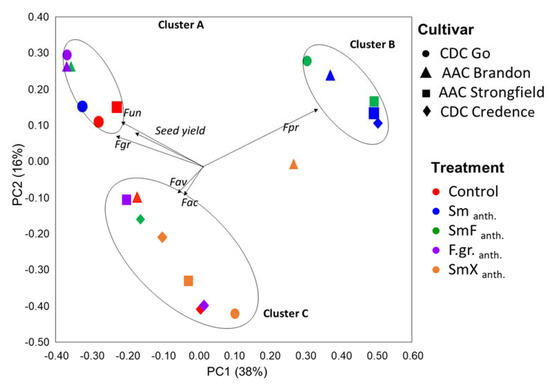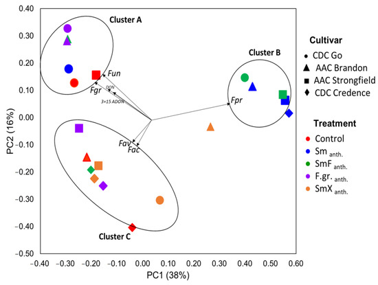 Beta diversity of Fusarium OTUs, obtained using Illumina ITS sequences, was visualized using PCoA analysis. The results presented in Figure 4 indicate that both plant cultivar and treatment influenced the Fusarium community structure and mycotoxin production associated with common wheat and durum wheat seeds. Total variance in the dataset could be explained to an extent of 38% by the first component, and the second component explained another 16%. Ordination results depicted the presence of three clusters corresponding with (A) mostly CDC Go samples and Fusarium treatment, SmF anth., (B) mostly AAC Strongfield samples with Sm anth. and SmF anth. treatments, and (C) mostly CDC Credence samples and SmX anth treatment. A positive correlation was detected between F. graminearum (Fgr) and F. unclassified (Fun) with Cluster A; F. proliferatum (Fpr) with Cluster B; and F. avenaceum (Fav) and F. acuminatum (Fac) with Cluster C. The mycotoxins DON and 3+15ADON were also associated with F. graminearum and unclassified Fusarium (Fun) within the F. graminearum complex in cluster A. No correlation between DON and 3+15ADON was observed with any other Fusarium species of clusters B and C. Permanova analysis indicated a tendency (p = 0.08) of F.gr.anth treatment effects on Fusarium communities and associated mycotoxins (Table 6). As shown in Figure 5, the agronomic trait harvested wheat weight/seed yield was also positively associated with CDC Go and AAC Brandon of Cluster C. Association between AAC Strongfield and harvested seed weight/seed yield was also observed. No correlation was observed between CDC Credence and seed yield, with this possibly being attributable to the low success rate of CDC Credence with F.gr.anth treatment. Permanova analysis indicated a tendency of higher effect of BCA (p = 0.08) on Fusarium communities and associated mycotoxins compared to the cultivar effect (p = 0.51); Table 7.