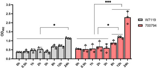 Cytotoxicity induced by S. suis infection. PAM-Tang cells were infected with S. suis vir-700794 or S. suis avir-W7119 at MOI = 1 and incubated for 0.5, 1, 2, 3, 8, 12, or 24 h, negative control expressed as 0 h. The triangles represent S. suis W7119 infection group (n = 3), diamonds represent S. suis 700794 infection group (n = 3). Culture supernatants were measured for their LDH activity and expressed as optical density (OD492). Each number represents the mean ± SD generated from three cell supernatants at each time point, and experiments were repeated three times. significance was determined using two-way ANOVA and Tukey’s multiple-comparison test; ns: not significant; *: p < 0.05; ***: p < 0.001.