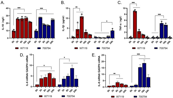 S. suis induces expression of inflammatory mediators in PAM-Tang cells. PAM-Tang cells were infected with S. suis vir-700794 or S. suis avir-W7119 at MOI = 1 for 3, 8, 16, or 24 h, negative control expressed as 0 h. After infection, ELISA kits were used to detect culture supernatants levels of IL-18 (A), IL-1β (B), and TNF-α (C). The squares represent S. suis W7119 infection group (n = 3), circles represent S. suis 700794 infection group (n = 3). Quantitative RT-PCR assay was used to detect transcriptome levels of IL-6 (D) and IL-8 (E) in cells after infection. All treatments were carried out in three wells, and experiments were repeated three times. The data used for statistical analysis represent the mean ± SD of cytokines secreted into the cell supernatant at each time point, significance was determined using two-way ANOVA and Tukey’s multiple-comparison test; *: p < 0.05; **: p < 0.01; ***: p < 0.001.