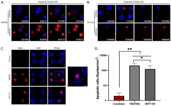 We used live-cell imaging to investigate apoptosis induced in PAM-Tang cells by S. suis. PI is a nucleic acid dye, which can penetrate the cell membrane and stain the nucleus red in the late stage of apoptosis. At about 8 hpi with vir-700794, we observed a few dead cells (Figure 6A) which increased in number by around 10 hpi (Supplementary Video S2). Similarly, cells infected with avir-W7119 began to die, but a bit later, around 15 hpi (Figure 6B). Subsequently, a TUNEL assay detected apoptotic signals colocalizing with cell nuclei, and apoptotic bodies consisting of membrane-bound fragments with condensed cytoplasm and nuclei (Figure 6C). The number of apoptotic cells induced by vir-700794 was significantly higher (p < 0.05) than that induced by avir-W7119 (Figure 6D).